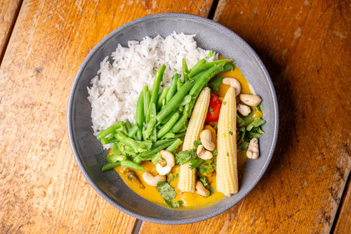 Ingredients: Baby corn, Courgettes, Mushroom, Peppers, Mange tout, Cashew nuts, Bean sprouts, Rice, Thai Red Curry Paste, Coconut milk.
