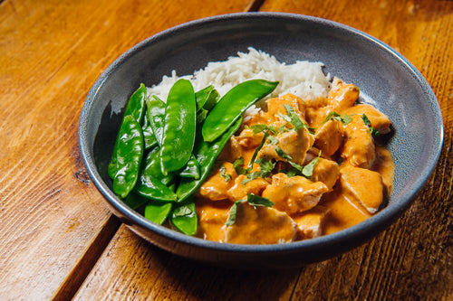 Ingredients: Beef Steak Mince, Onions, Garlic, Spices, Mang tout, Chopped Tomatoes, Tomatoes, Spinach, Basmati Rice,Corriander.