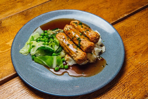 Veggie Sausage with Cabbage, Peas, Mustard Mash and Gravy