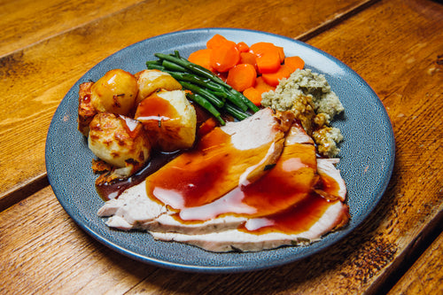 Turkey breast, Rosemary, Gravy, Lemon, Potatoes, Garlic, Vegetable Oil, Carrot, Green Beans, Sage & Onion Stuffing Mixture, Allergen Free Gravy Powder