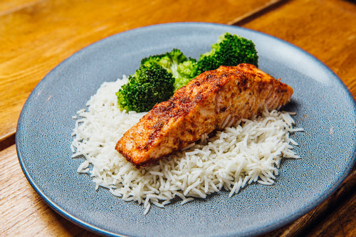 Ingredients: Salmon, Cajun seasoning, Rice, Broccoli.