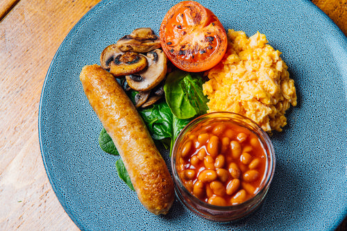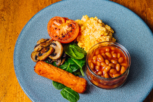 Ingredients: Veggie sausage made from Pea protein, Scrambled Egg, Beans, Tomato, Mushroom and Spinach